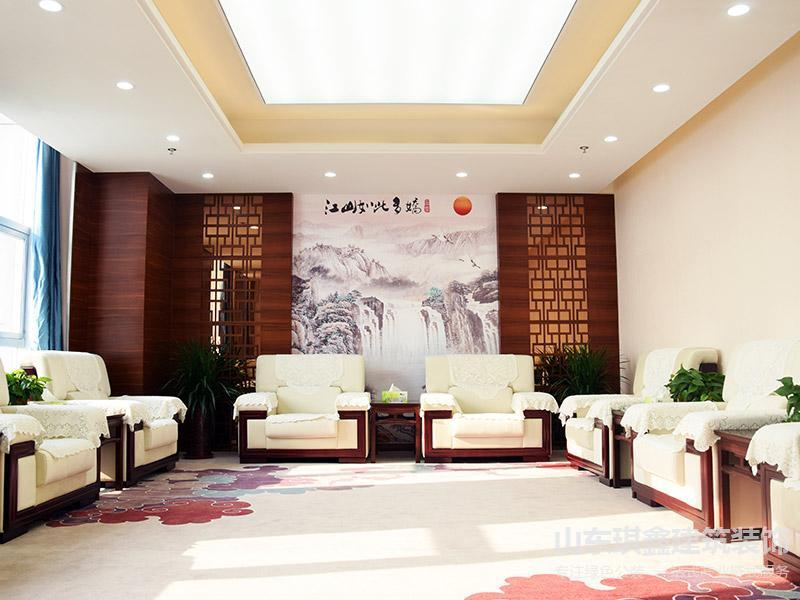 會議室使用方形照明吸頂燈配以木質(zhì)裝飾板簡約大氣,遮光簾和吸音地毯保證會議不受足音和窗外雜音干擾同時保證投影儀的使用。接待室使用線性裝飾使整個室內(nèi)空間簡潔通透優(yōu)雅,米色沙發(fā)和暖色地毯配以暖色燈光營造放松氛圍;地毯上的民族花紋與墻上的工筆水墨畫相呼應(yīng),增添文化氛圍。走廊使用玻璃幕墻和金屬框架,保證通光性的同時磨砂條保證了辦公私密性的同時防止碰撞事故發(fā)生。