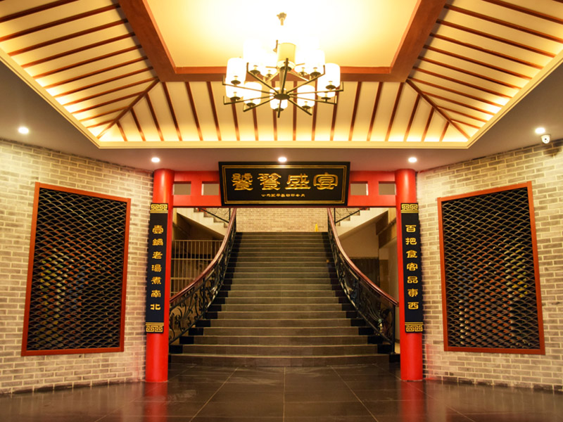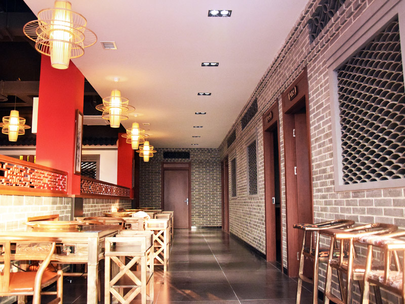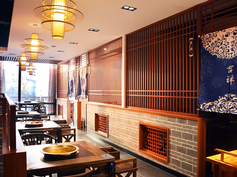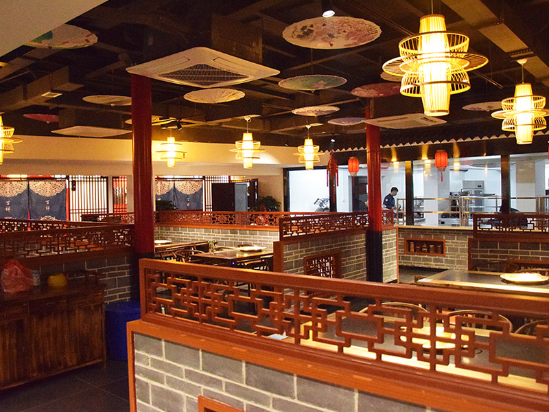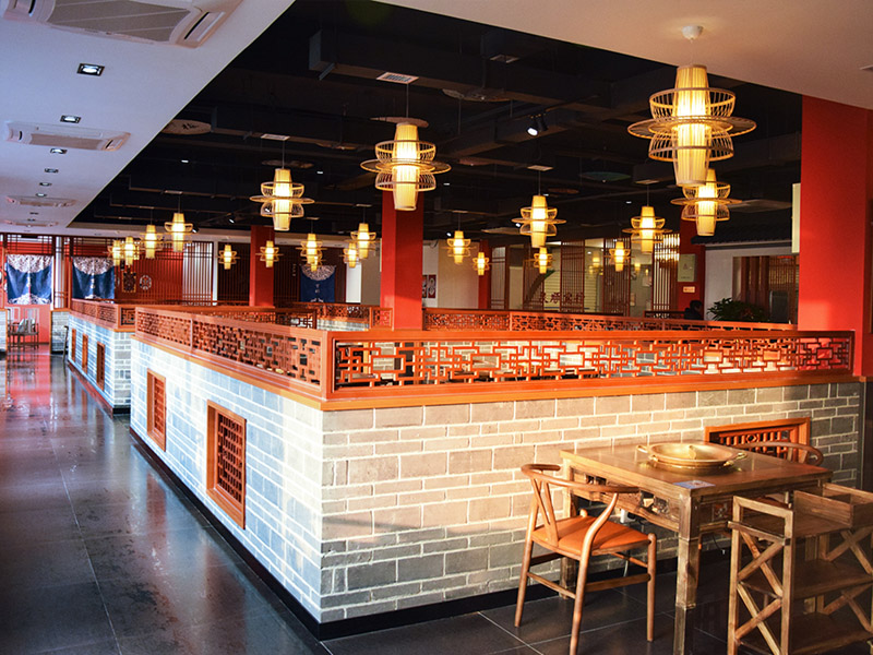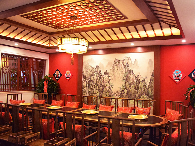 大廳紅色漆柱與仿古式幾案和官帽椅相呼應搭配工筆水墨畫和燈籠式樣吊燈,雕花木質柵欄既輔助塑造整體環境又保證了就餐的私密性。
