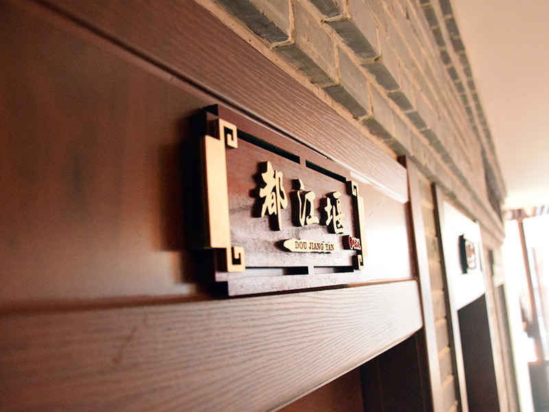二樓招牌創意性使用了時下大熱的活字印刷板式作為招牌底板圖案,深灰色底色給人一種沉穩和文化感,通過顏色的反差使客人注意力集中在招牌本身上,同時底板刻印的本店特色也能加深顧客印象。